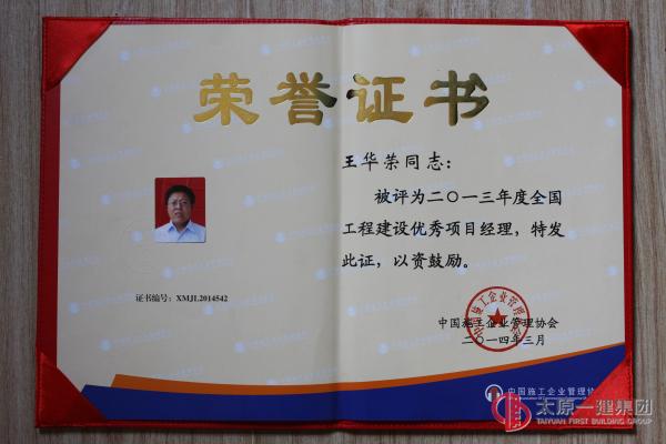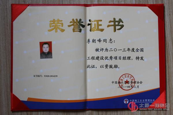 4月17日-19日,中國施工企業(yè)管理協(xié)會(huì)召開2013年度工作會(huì)議,集團(tuán)公司榮獲2013年度“全國優(yōu)秀施工企業(yè)”稱號(hào);王貴聰榮獲2013年度“中國工程建設(shè)高級(jí)優(yōu)秀職業(yè)經(jīng)理人”稱號(hào);李朝峰、王華榮分別榮獲2013年度“全國工程建設(shè)優(yōu)秀項(xiàng)目經(jīng)理”稱號(hào)。