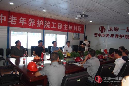 2015年8月3日,第二項(xiàng)目工程管理處承建的“晉中市老年養(yǎng)護(hù)院項(xiàng)目”主體結(jié)構(gòu)順利封頂。參加封頂儀式的有:晉中市民政局局長(zhǎng)李建平、晉中市建設(shè)局代建辦主任杜毓格、代建單位晉中市建筑勘察設(shè)計(jì)院院長(zhǎng)高曉東、山西新盛建設(shè)監(jiān)理有限公司總監(jiān)理工程師楊秋收、太原市第一建筑工程集團(tuán)有限公司董事長(zhǎng)王貴聰和集團(tuán)公司常務(wù)副總經(jīng)理張歧泰、集團(tuán)公司董事王斌、副總經(jīng)理李偉、總經(jīng)理助理陳斌及項(xiàng)目部全體成員。