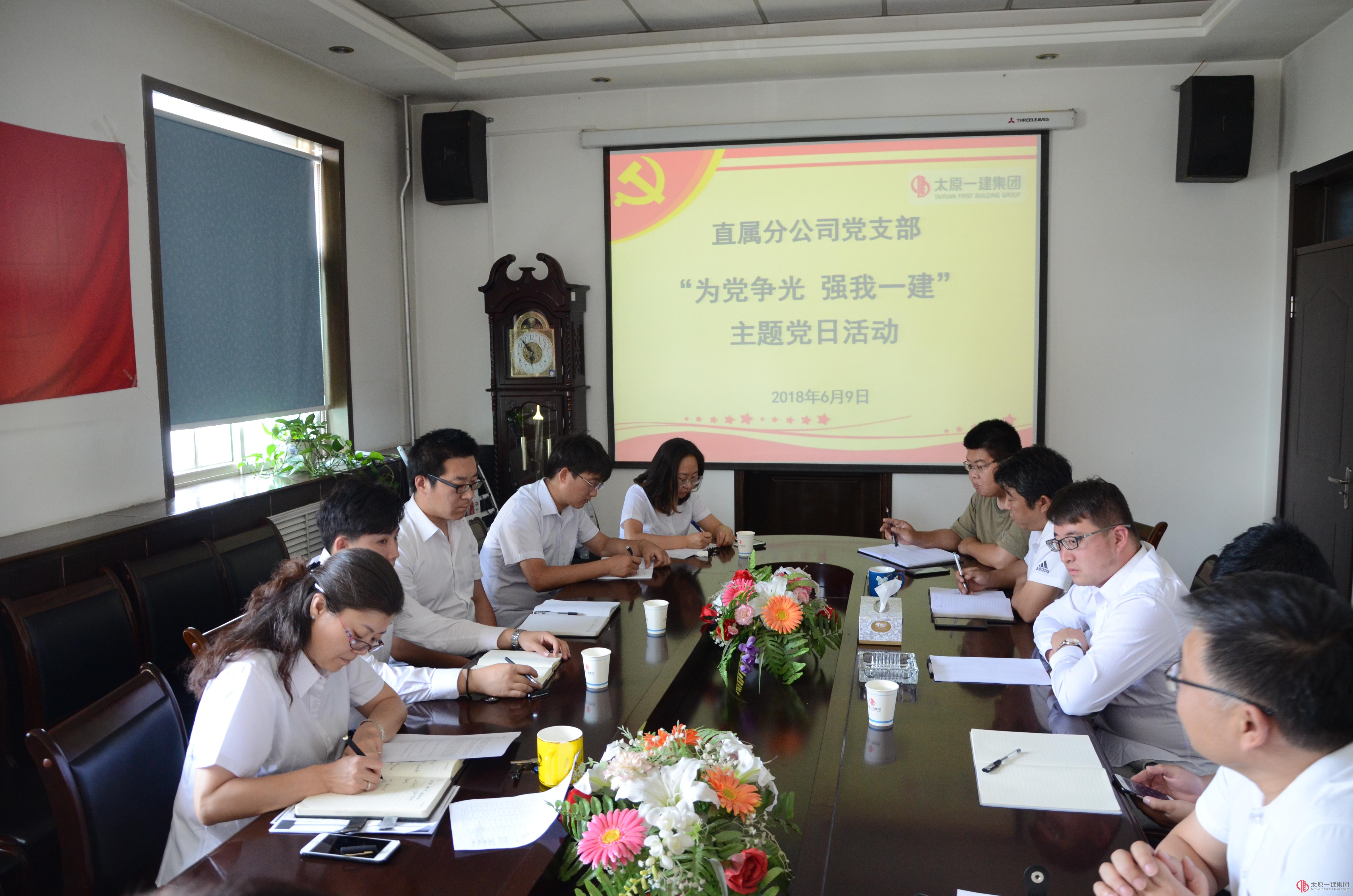 6月9日下午,直屬分公司黨支部召開“為黨爭光,強我一建”主題黨日活動。活動由黨支部副書記高衛國主持,全體黨員、入黨積極分子、入黨申請人參加了本次活動。活動的主要內容有:⒈支部書記郭貴法對上半年支部黨建工作進行了總結和分析,對“七一”前各項黨建工作進行了具體安排。⒉支部副書記高衛國對上半年集團公司集中檢查黨建工作重點情況進行了通報。⒊觀看了《信仰》、《長征》等記錄片節選。⒋上黨課。本次黨課采取了優秀黨員輪流講黨課的方法,讓他們用自己的語言把學習心得亮出來、把學習體會講出來、把學習經驗傳出來,充分說出了自己的“肺腑之言”。最后,黨支部書記郭貴法帶領大家學習了黨史同時提出要求:一要努力學習黨的基本知識、方針、政策及習總書記系列講話精神,深該領會習近平新時代特色社會主義思想的重要內涵;二要充分發揮各自的先鋒引領作用,以身作則,強化格局意識,增強工作能力,牢記工作職責,牢固樹立"我能行,我必行"的信念,銘記“為黨爭光,強我一建“活動主題,以優異的工作業績迎接“七一”的到來。