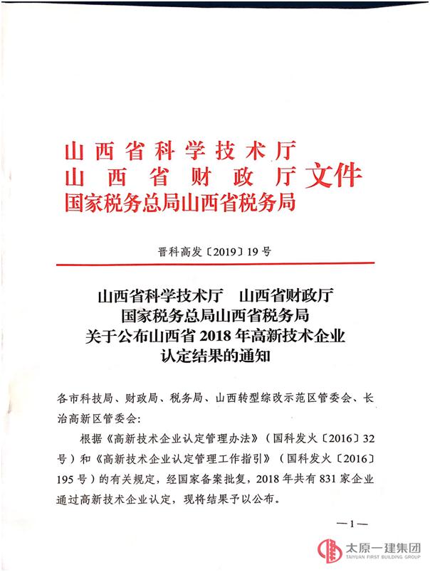 近日,山西省科學技術廳、山西省財政廳、國家稅務總局山西省稅務局聯合發文(晉科高發【2019】19號),認定太原市第一建筑工程集團有限公司為2018年高新技術企業。