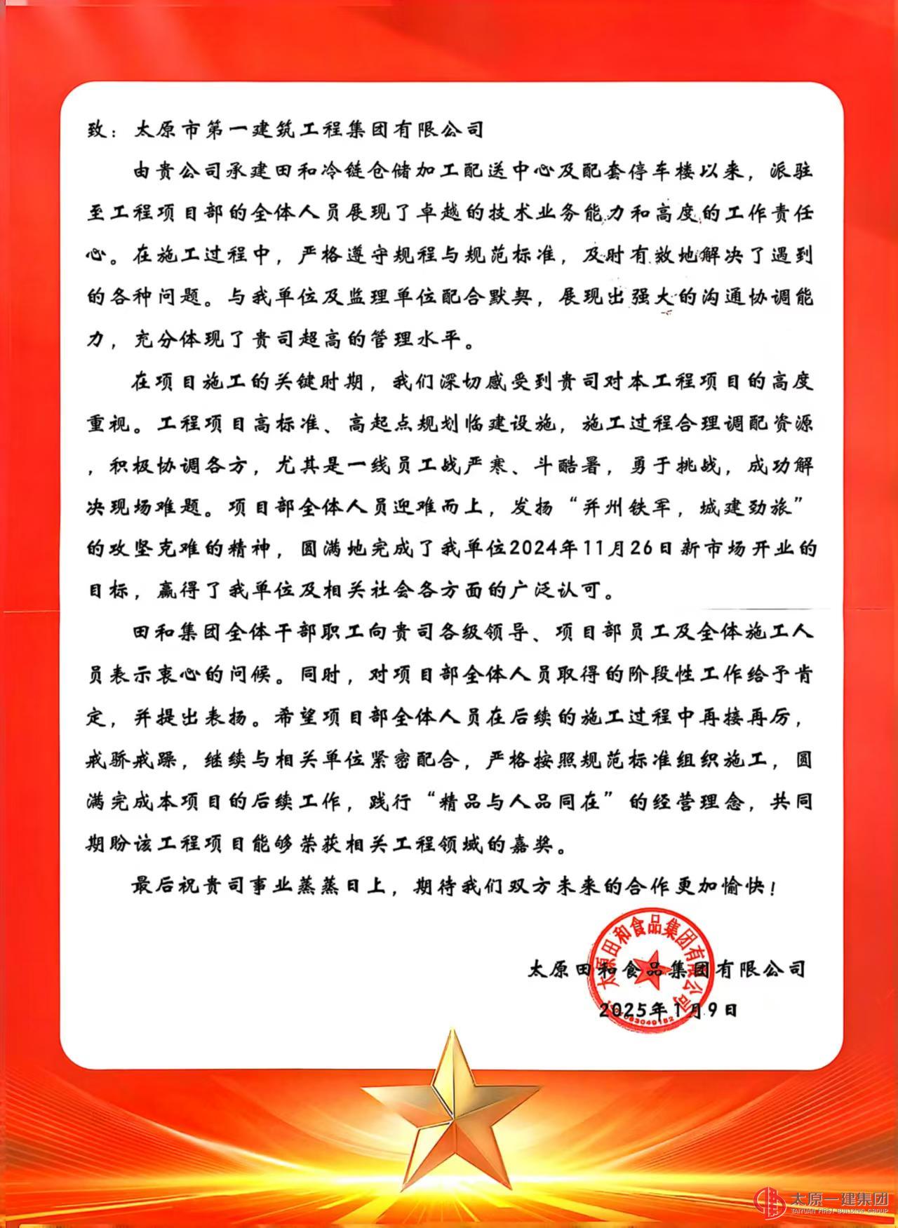 2025年1月9日,太原田和食品集團有限公司董事長劉浩明一行六人蒞臨太原一建集團,并向太原一建集團送來表揚信。